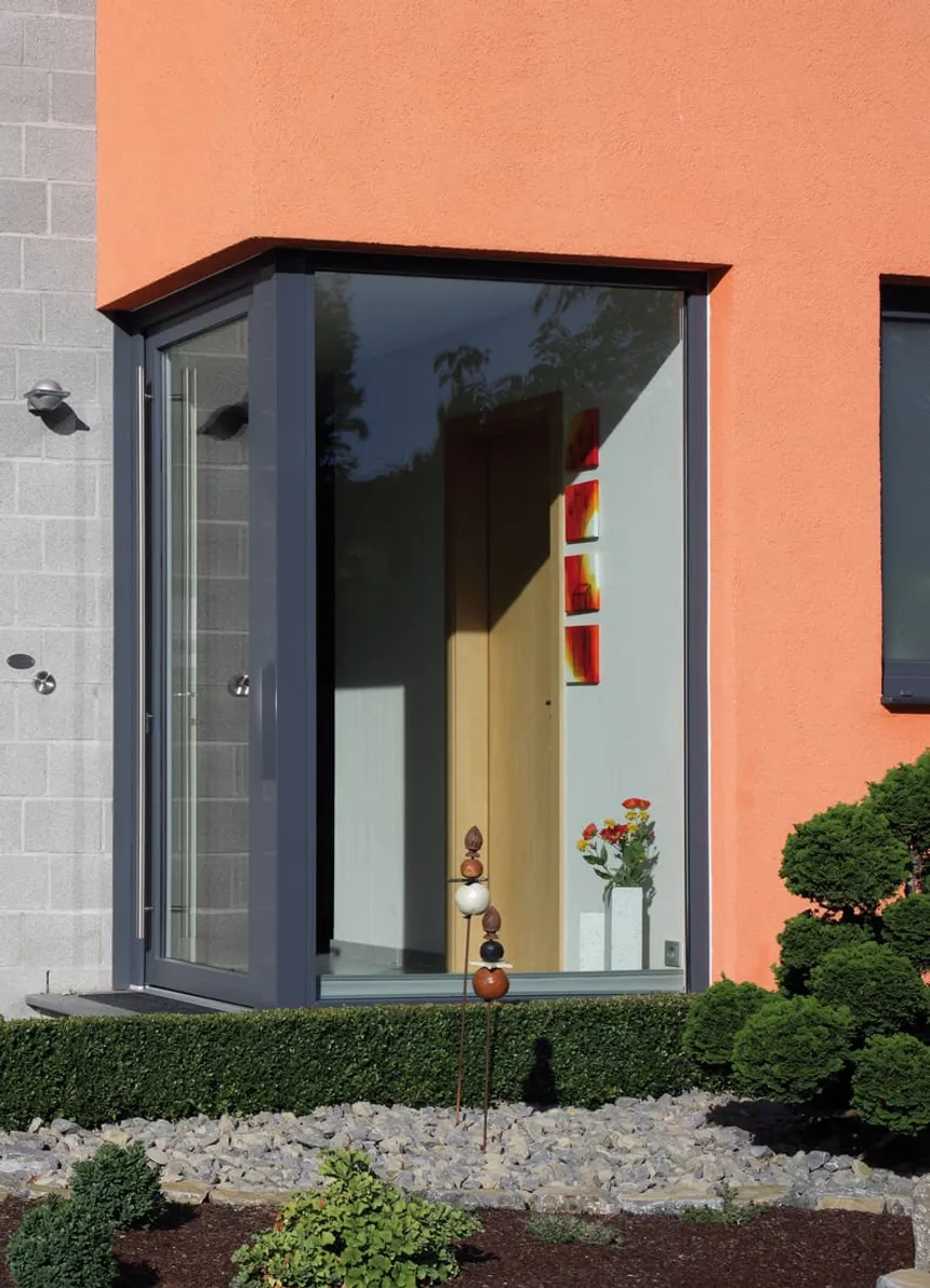 El sistema AluClip permite lograr un aspecto de puerta que coincide perfectamente con los sistemas de fachada de aluminio, manteniendo al mismo tiempo una acogedora superficie de PVC en el interior de la casa.