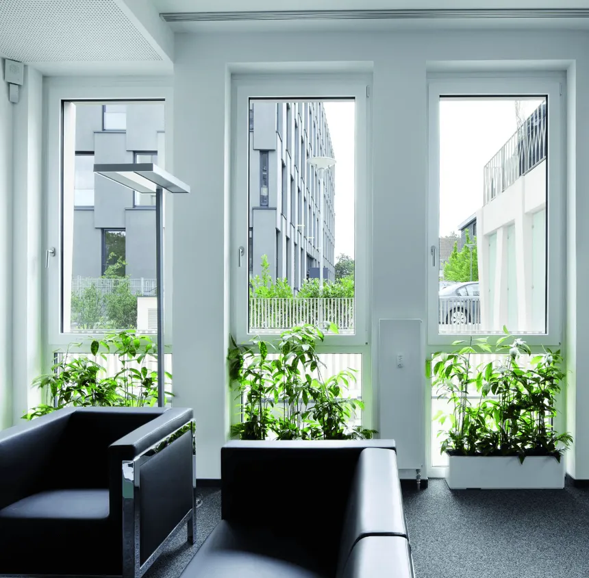 Los diseñadores de Kömmerling minimizaron el ancho visible de la combinación marco-hoja a 116 mm. Esto permite aumentar el área de la parte transparente (acristalamiento). Obtiene un 5-10% más de luz solar natural en el interior comparado con perfiles de PVC anchos estándar, ampliando visualmente el espacio.