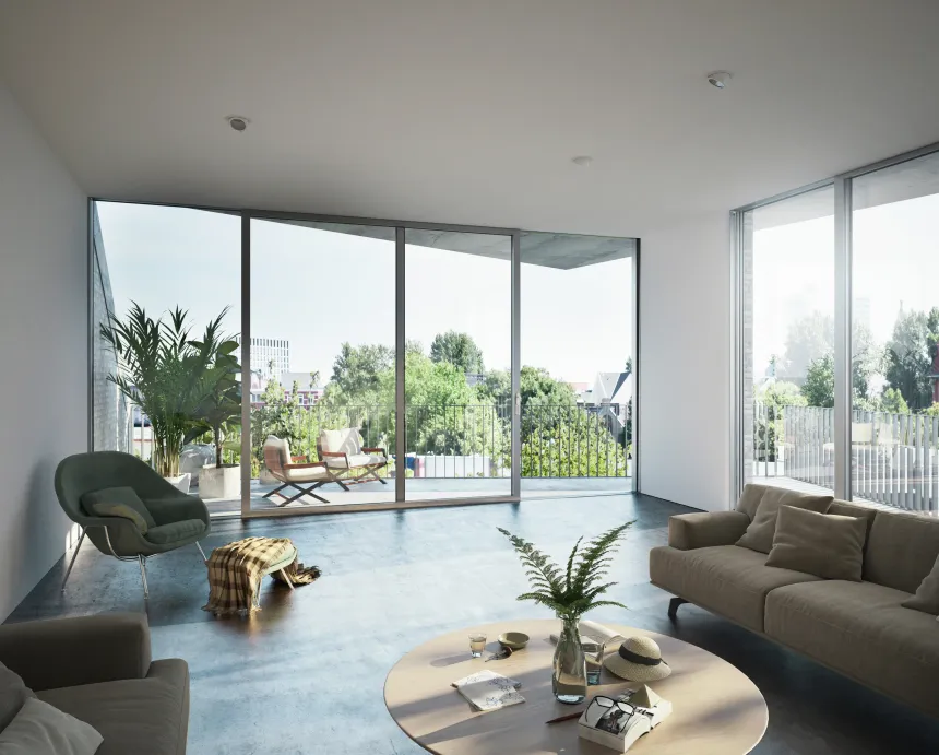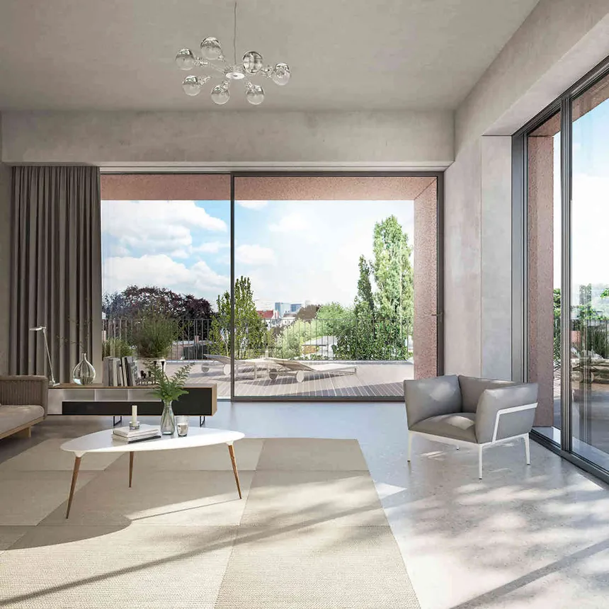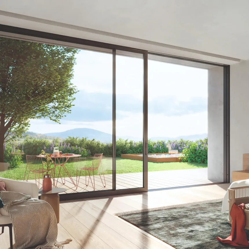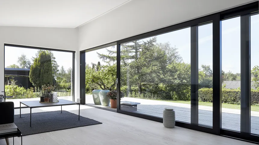Al igual que en la serie 60, aqui estan disponibles las soluciones de diseño DesignLine con anchura minima de junta entre hojas (40 mm) y herrajes completamente ocultos, lo que hace que la construccion maciza y calida parezca visualmente ligera y aerea.