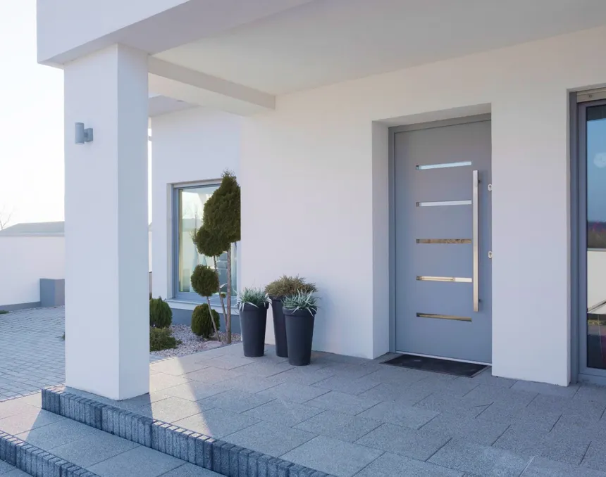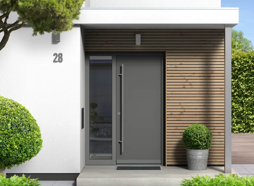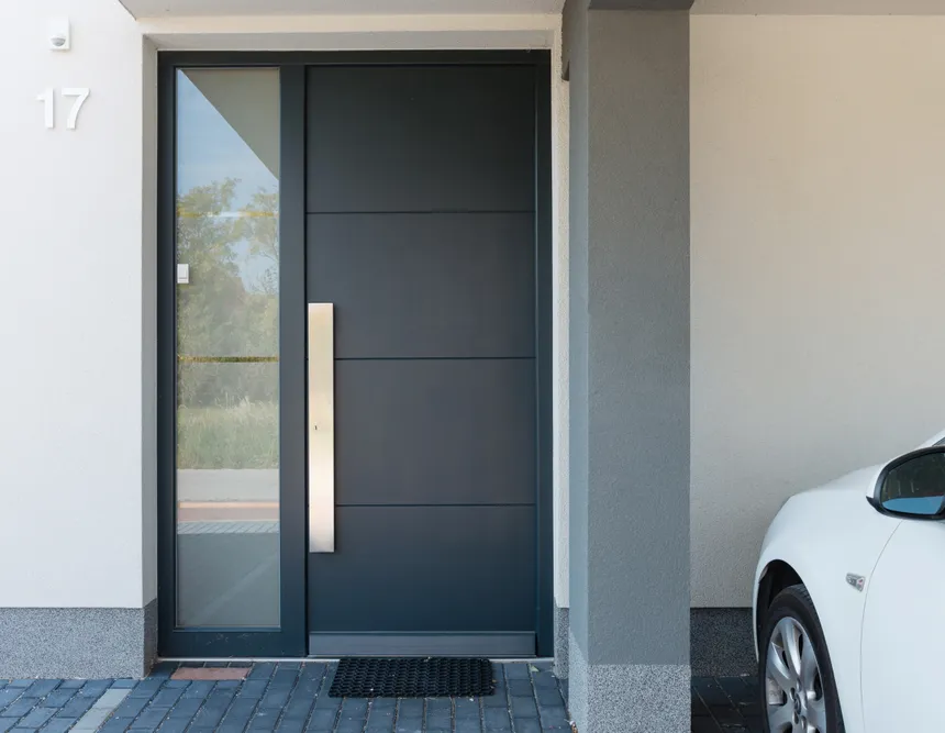- Estética del aluminio: Obtiene el diseño monolítico de moda sin juntas ni transiciones visibles, característico de las costosas puertas de aluminio, pero al precio del PVC.